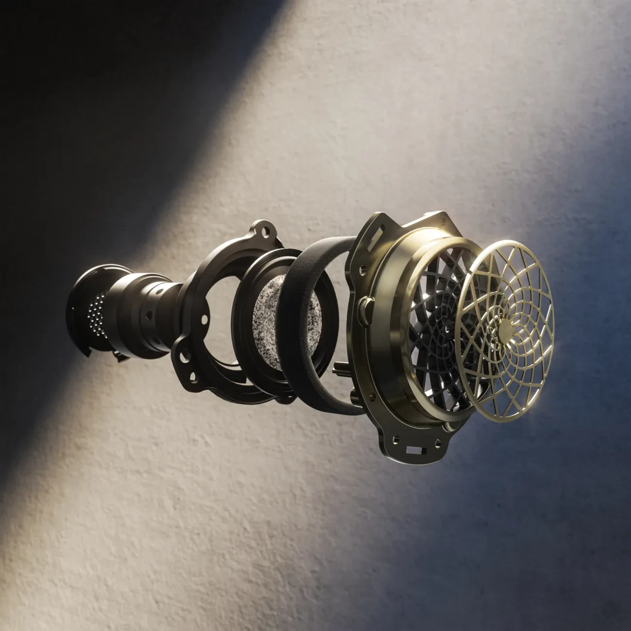 Licht en ruimtelijk, geïnspireerd op de akoestiek van concertzalen. Afgewerkt in Linen en Gravity Gray, met Open Pore Crown Cut Walnut en Portland DINAMICA.